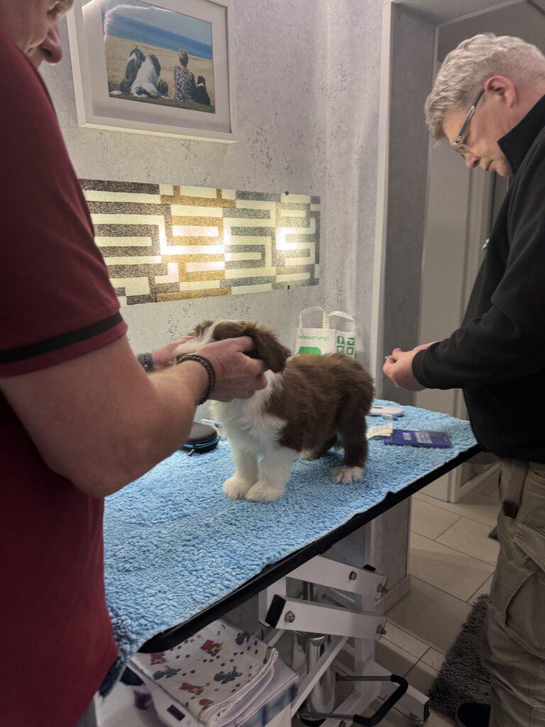 Unser Tierarzt, R. Bandel war am 18.02.2026 zum impfen vor Ort. es wurden alle Welpen eingehend untersucht und sie haben alle ihre erste Impfung erhalten. Alle waren sehr tapfer und haben alles ohne laut über sich ergehen lassen…..auch die beiden Jungs !