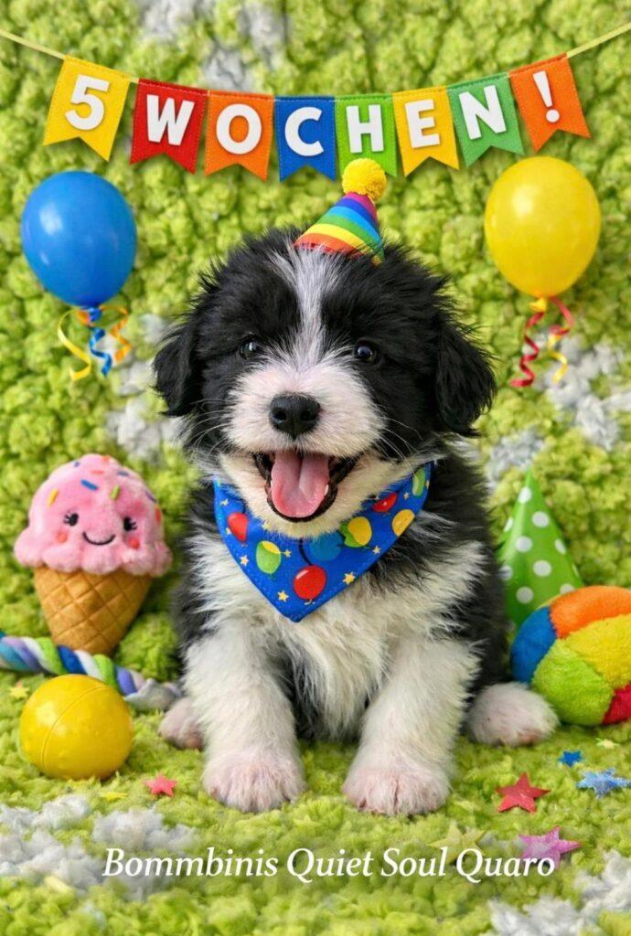 Die fünfte Woche ist eine wundervolle Phase des Lernens,Spielens und Wachsens – und unsere Welpen entwickeln sich alle prächtig . Nun darf auch der erste Besuch kommen und sich mt ihren Welpen anfreunden.