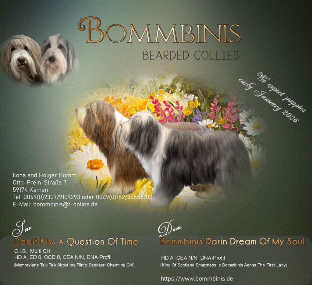 Anfang Januar 2026 erwarten wir wundervolle Welpen aus der Verpaarung unserer Bommbinis Darin- Dream of my Soul und Multi Ch. Dasilt Kiss a Question of Time-Rufname Leo. Die Ultraschalluntersuchung ist vielversprechend, so dass wir auf 6-7 schwarz/weiße und vielleicht braun/weiße Welpen hoffen dürfen. Wir freuen uns schon sehr darauf. Auch freuen wir uns darauf die neuen Welpenfamilien kennenzulernen. Wenn sie Interesse haben einen Bommbini ihr eigen zu nennen, dann bewerben sie sich unter bommbinis@t-online.de oder 0152 34 555 100.